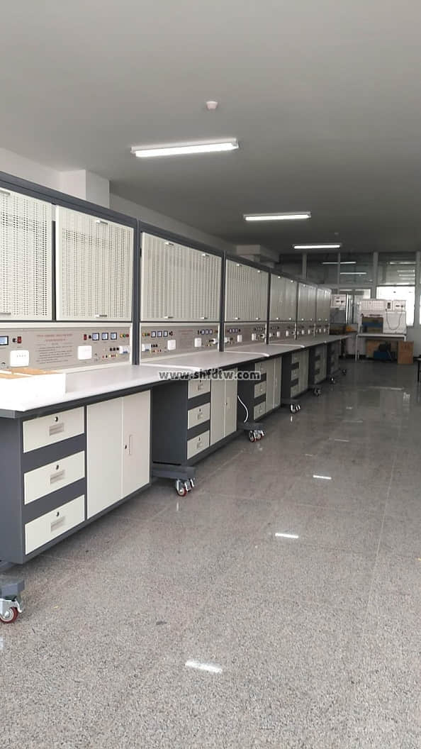 4、實(shí)訓(xùn)桌桌面采用25mm麻灰色高密度層壓板封邊特制,有效提高絕緣等級(jí);實(shí)驗(yàn)桌底部裝有至少4個(gè)導(dǎo)向輪,方便實(shí)訓(xùn)臺(tái)架移動(dòng);