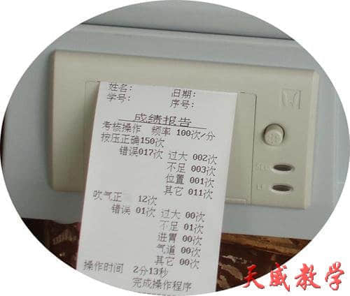 瞳孔由原來(lái)的散大自動(dòng)縮小恢復(fù)正常,電腦顯示器的液晶屏上顯示正常動(dòng)態(tài)心電圖,說(shuō)明人被救活,可按打印鍵即雙人操作成績(jī)報(bào)告單(日期、姓名、學(xué)號(hào)、序號(hào)、所需時(shí)間、吹氣正確、錯(cuò)誤次數(shù)與按壓正確、錯(cuò)誤的次數(shù)等功能打印)。以供考核成績(jī)?cè)u(píng)定及存檔。(注:操作中,進(jìn)行胸外按壓與人工呼吸出現(xiàn)錯(cuò)誤及不按操作程序進(jìn)行,有語(yǔ)言提示,成績(jī)有記錄。不停機(jī),調(diào)整正確后繼續(xù)操作)
