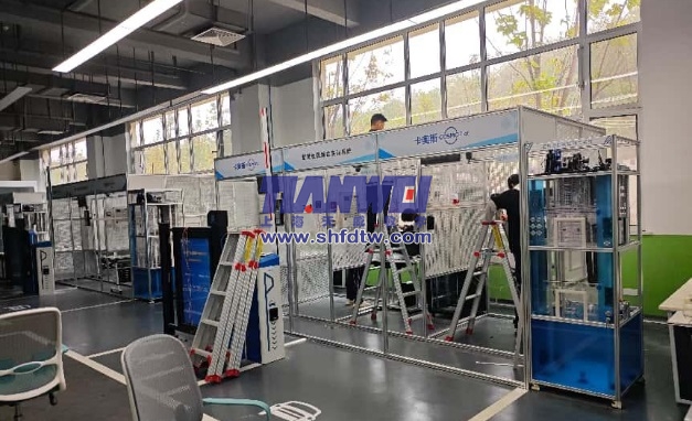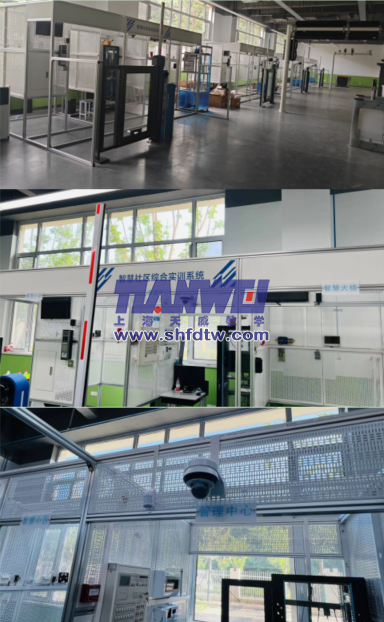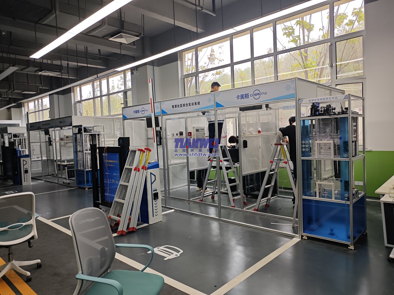 由鋁合金型材框架和安裝布線網(wǎng)孔板組成,4660mm×2220mm×2330mm(長×寬×高),分為智能大樓、智能小區(qū)、管理中心和樓道等區(qū)域,智能大樓設(shè)計為兩層結(jié)構(gòu),器件采用自攻螺絲和工程塑料卡件配合安裝。 |