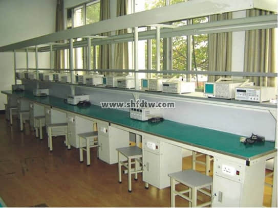 c、線體每?jī)晒の慌?0W日光燈照明一套,每工位配四位工位插座一只(其中2為為二腳,2位為三腳),帶烙鐵筒帶插座工具箱一只(工具箱尺寸為寬300mm,高400mm,深220mm),工藝圖板一套(A3無色透明,2塊); d、臺(tái)面采用厚18mm雙面貼塑板制作,上鋪綠色防靜電橡皮,槽鋁包邊;