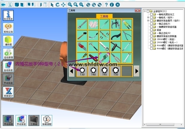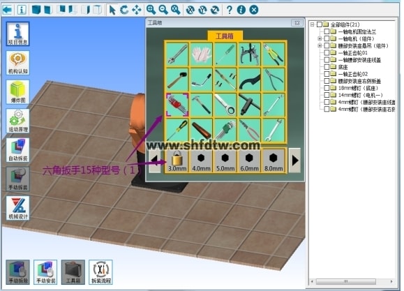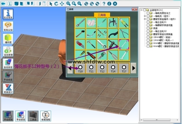 系統(tǒng)提供20種機械拆裝工具:活動扳手、手套、一字螺絲刀、拉馬、平口鉗、膠錘、套筒扳手、拔銷器、勾扳手、外卡鉗、內(nèi)六角扳手、鐵錘、棘輪扳手、卡盤扳手、梅花扳手、十字螺絲刀、銅棒、內(nèi)梅花扳手、內(nèi)卡鉗以及雙頭呆扳手。其中內(nèi)六角扳手15種型號,包括3mm、4mm、5mm、6mm、8mm、10mm、12mm、14mm、16mm、18mm、20mm、22mm、24mm、27mm以及30mm;棘輪扳手5種型號,包括8/9mm、10/11mm、12/13mm、14/15mm以及16/18mm;梅花扳手12種型號,包括T4、T5、T7、T8、T9、T10、T11、T12、T14、T17、T19、T22,內(nèi)梅花扳手9種型號,包括T10、T15、T20、T25、T27、T30、T40、T45以及T50;雙頭呆扳手12種型號,包括T4、T5、T7、T8、T9、T10、T11、T12、T14、T17、T19、T22。提供符合上述功能的軟件截圖。