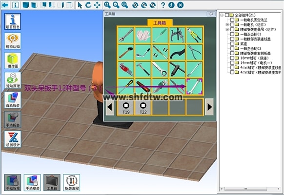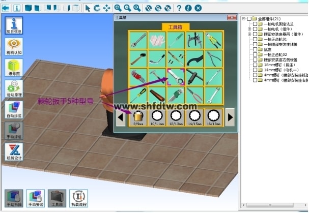 9.手動拆裝:系統(tǒng)提供手動拆裝功能,手動拆裝過程可進行自動判斷拆裝順序及拆裝工具選擇的正確性,并且在手動拆裝模式下,場景中會相應增加工具箱。