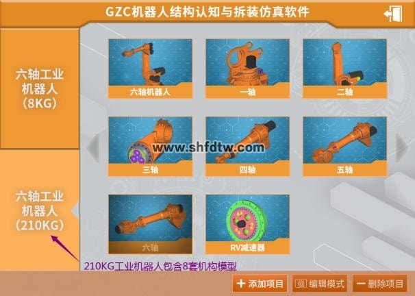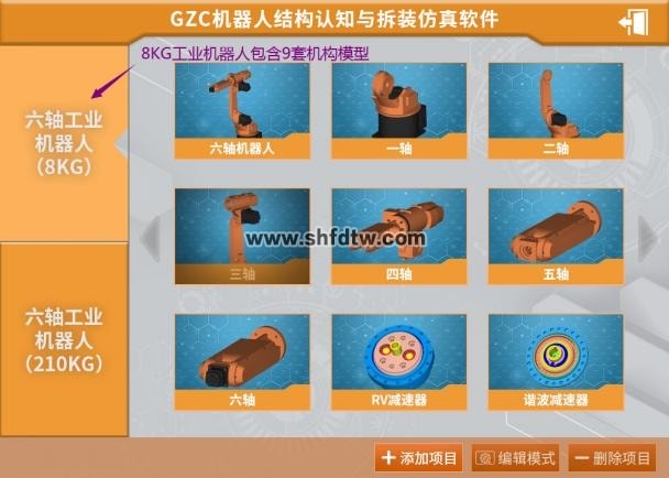 3.2種型號17套六軸機器人機構(gòu)模型:系統(tǒng)內(nèi)置2種型號17套六軸機器人機構(gòu)模型。其中型號為8KG的工業(yè)機器人包含六軸機器人整體1套、一軸機構(gòu)1套、二軸機構(gòu)1套、三軸機構(gòu)1套、四軸機構(gòu)1套、五軸機構(gòu)1套、六軸機構(gòu)1套、RV減速器機構(gòu)1套、諧波減速器機構(gòu)1套;型號為210KG的工業(yè)機器人包含六軸機器人整體1套、一軸機構(gòu)1套、二軸機構(gòu)1套、三軸機構(gòu)1套、四軸機構(gòu)1套、五軸機構(gòu)1套、六軸機構(gòu)1套、RV減速器機構(gòu)1套。提供符合上述功能的軟件截圖。
