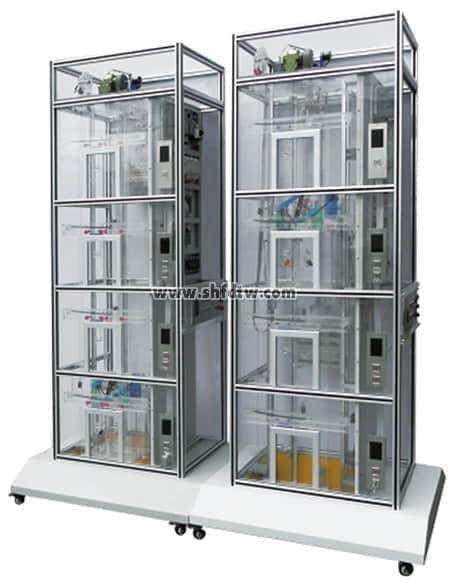 1、由兩臺四層透明仿真教學(xué)客梯組成,由層外兩處按鈕共同控制。