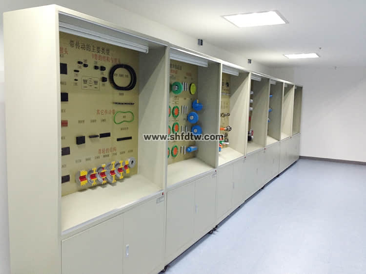 4、柜頂部裝有照明日光燈,柜背設有對開門,有利維護設備和方便維修。柜下部設有柜箱,方便存放單個模型、實驗箱及相關實驗文檔。柜底裝有萬向輪,方便移動,符合人機工程要求。