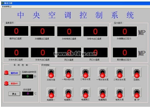 整個中央空調(diào)采用PLC可編程控制器及工業(yè)總線控制,由計算機通過通信總線與PLC進(jìn)行通信,控制整個中央空調(diào)的運行??照{(diào)的運行參數(shù)由各類傳感器進(jìn)行采集,并通過通信總線送入計算機中,通過專用中央空調(diào)組態(tài)控制軟件進(jìn)行實時監(jiān)控。在現(xiàn)場控制柜上可顯示中央空調(diào)的所有運行數(shù)據(jù),可進(jìn)行全手動和自動運行操作。