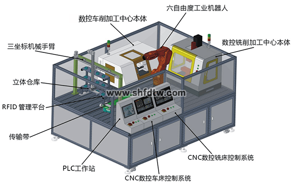 本套設(shè)備是以小型的柔性制造系統(tǒng)為載體,主要特點(diǎn)是占地空間小、操作安全、涉及的知識(shí)點(diǎn)豐富、綜合,系統(tǒng)性強(qiáng)、成本低、師生容易上手等;主要是由一臺(tái)工業(yè)6軸自由度機(jī)器人、一臺(tái)三坐標(biāo)機(jī)械手臂、一臺(tái)柔性數(shù)控車(chē)床、一臺(tái)柔性數(shù)控銑床、RFID系統(tǒng)、PLC工作站、智能倉(cāng)庫(kù)、中控臺(tái)、傳輸帶等部份組成,實(shí)現(xiàn)自動(dòng)化上下料、加工等無(wú)人工作環(huán)節(jié),機(jī)器人按指令分別給兩臺(tái)機(jī)器送料取料;該系統(tǒng)能夠?qū)崿F(xiàn)工業(yè)機(jī)器人上下料工作站系統(tǒng)的編程、上下料系統(tǒng)的集成、RFID系統(tǒng)應(yīng)用、PLC系統(tǒng)編程、數(shù)控車(chē)床編程加工、數(shù)控銑床編程加工、現(xiàn)場(chǎng)總線的通訊實(shí)訓(xùn)等環(huán)節(jié)。讓學(xué)生輕松掌握工業(yè)6軸機(jī)器人上下料與數(shù)控機(jī)床組建柔性加工生產(chǎn)系統(tǒng),能滿(mǎn)足學(xué)生對(duì)工業(yè)機(jī)器人學(xué)習(xí)及操作的需要,學(xué)生通過(guò)該套系統(tǒng)的學(xué)習(xí)與訓(xùn)練,對(duì)智能生產(chǎn)無(wú)人工廠的組建整體性應(yīng)用有全面的了解與體驗(yàn)。