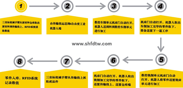 三坐標(biāo)機(jī)械手臂從原材料倉(cāng)庫(kù)取出原材料到傳輸線上,RFID系統(tǒng)讀取數(shù)值,由傳輸線運(yùn)送到6自由度工業(yè)機(jī)器人端,由負(fù)責(zé)數(shù)控機(jī)床的上下料工作,數(shù)控車(chē)削單元將零件加工完畢后,機(jī)床自動(dòng)開(kāi)門(mén),零件由機(jī)器人送置到數(shù)控銑削加工中心進(jìn)行加工下一道工序,加工完畢后銑床自動(dòng)開(kāi)門(mén),由機(jī)器人取出成品零件送置到傳輸帶上,輸送到智能倉(cāng)庫(kù)端,由三坐標(biāo)機(jī)械手臂將成品零件入庫(kù),RFID系統(tǒng)讀取數(shù)值。學(xué)生在熟練掌握該系統(tǒng)的操作與編程以后,也可以對(duì)零件類(lèi)型和加工工藝進(jìn)行調(diào)整。