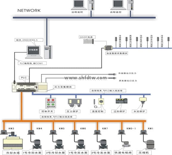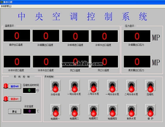 整個(gè)中央空調(diào)采用PLC可編程控制器及工業(yè)總線控制,由計(jì)算機(jī)通過通信總線與PLC進(jìn)行通信,控制整個(gè)中央空調(diào)的運(yùn)行??照{(diào)的運(yùn)行參數(shù)由各類傳感器進(jìn)行采集,并通過通信總線送入計(jì)算機(jī)中,通過專用中央空調(diào)組態(tài)控制軟件進(jìn)行實(shí)時(shí)監(jiān)控。在現(xiàn)場控制柜上可顯示中央空調(diào)的所有運(yùn)行數(shù)據(jù),可進(jìn)行全手動(dòng)和自動(dòng)運(yùn)行操作。