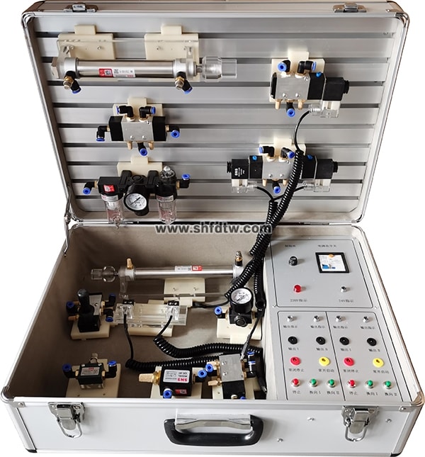 1、實(shí)訓(xùn)箱主要由鋁合金機(jī)箱、各種標(biāo)準(zhǔn)氣動(dòng)工業(yè)元件、和電氣控制器件等