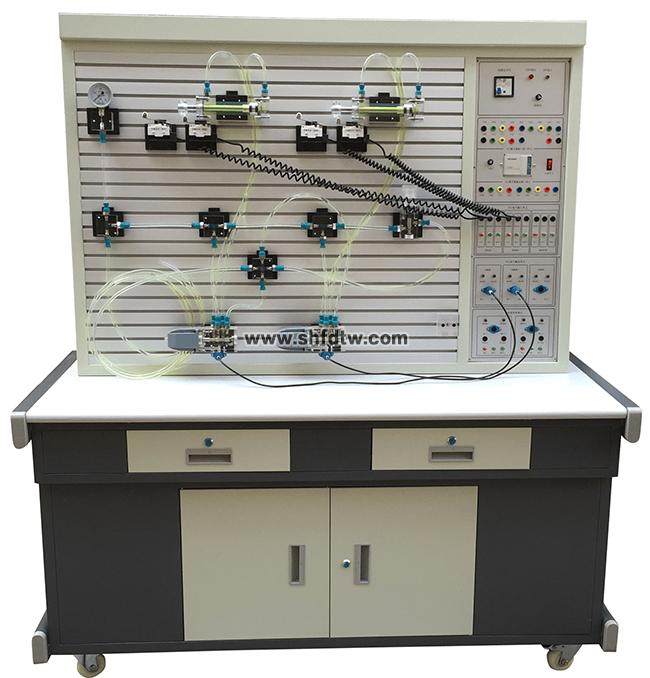 1、透明液壓繼電器控制實訓(xùn)裝置主要由實訓(xùn)桌、實訓(xùn)臺、液壓元件和電器控制器件等組件組成。