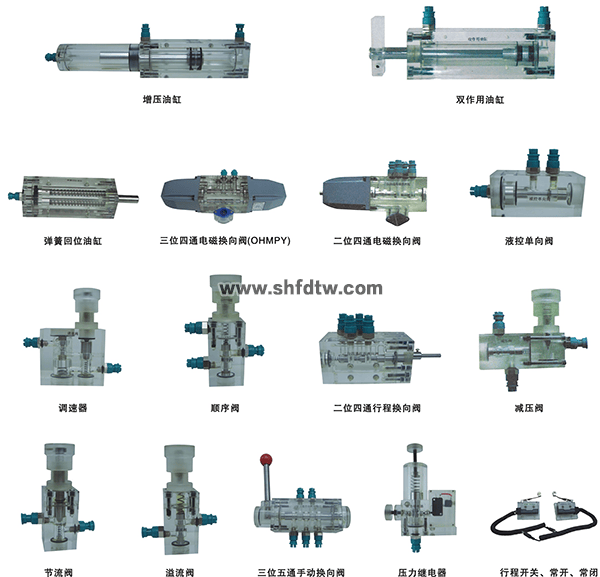 4、實訓(xùn)元件均為透明有機材料制成,便于了解掌握幾十種常用液壓元件的結(jié)構(gòu),性能及用途。掌握幾十種基本回路的工作原理,實訓(xùn)組裝回路快捷、方便。