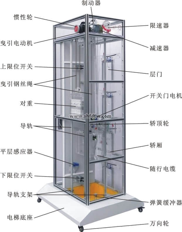 電梯是根據(jù)最常見(jiàn)的升降式電梯結(jié)構(gòu),采用透明有機(jī)材料制成,其結(jié)構(gòu)與實(shí)際電梯完全相同,且?guī)缀蹙邆淞藢?shí)際電梯的所有功能。事實(shí)上可以把它看作是小型化了的真實(shí)電梯。為了便于教學(xué),電梯大部分部件均是采用透明有機(jī)材料制成,使得電梯的內(nèi)部結(jié)構(gòu)一目了然;同時(shí),電梯的運(yùn)行過(guò)程,以及每個(gè)動(dòng)作都十分明了,且可以反復(fù)實(shí)際動(dòng)手操作。使學(xué)生能夠很直觀、透徹地了解、掌握電梯的結(jié)構(gòu)及其動(dòng)作原理,達(dá)到事半功倍的效果。解決了以往電梯教學(xué)中單純的理論教學(xué)方式或是參觀實(shí)際電梯時(shí)所帶來(lái)的不安全,無(wú)法全面了解其內(nèi)部結(jié)構(gòu)及運(yùn)行過(guò)程等種種實(shí)際問(wèn)題。