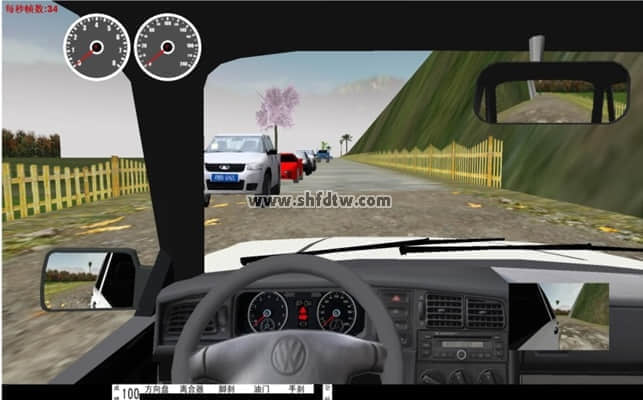 踩下離合器踏板,模擬器發(fā)動(dòng)機(jī)聲音變化,互動(dòng)視景呈減速變化;起步操作時(shí),抬離合器踏板過(guò)快系統(tǒng)自動(dòng)熄火。踩下制動(dòng)踏板互動(dòng)視景同步變化且有緊急制動(dòng)剎車(chē)聲。駐車(chē)制動(dòng)操縱桿拉起,能駐車(chē)制動(dòng)不滑溜。踩(抬)加速踏板,互動(dòng)視景跟隨加快(減慢)變化,發(fā)動(dòng)機(jī)聲音、車(chē)速表指針呈加速(減速)變化。檔位與離合器配合能逐級(jí)換擋,換擋正確后,互動(dòng)視景速度呈一致變化。按下喇叭按鈕,揚(yáng)聲器發(fā)聲,松開(kāi)時(shí)聲音立即停止。撥動(dòng)轉(zhuǎn)向指示燈開(kāi)關(guān),模擬的汽車(chē)同步左右指示和發(fā)聲。撥動(dòng)雨刮器開(kāi)關(guān),互動(dòng)視景中有雨刮器刮條雙向刮動(dòng)。撥動(dòng)照明燈開(kāi)關(guān),互動(dòng)視景中遠(yuǎn)燈與近燈響應(yīng)變化,互動(dòng)視景中出現(xiàn)撞主時(shí)有撞車(chē)聲。