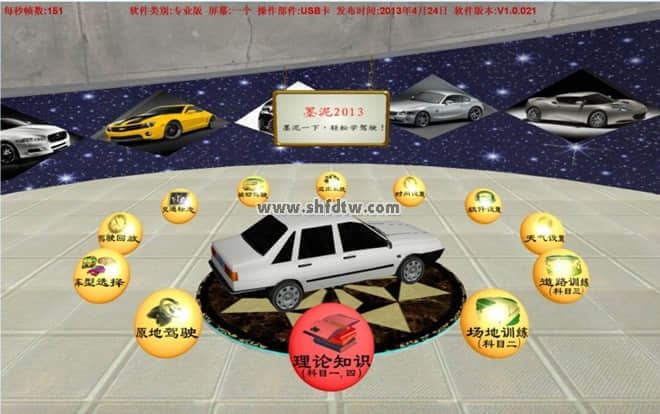 主界面中間是一輛在轉(zhuǎn)盤(pán)上旋轉(zhuǎn)的車(chē)輛,該車(chē)輛為當(dāng)前選擇進(jìn)行訓(xùn)練的車(chē)輛(可以是捷達(dá)、東風(fēng)、拖車(chē)等等)。圍繞車(chē)輛和轉(zhuǎn)盤(pán),共有12個(gè)按鈕,分別是:理論知識(shí)(包含科目一和安全文明駕駛考試)、場(chǎng)地訓(xùn)練(科目二)、道路訓(xùn)練(科目三)、天氣設(shè)置、軟件設(shè)置、時(shí)間設(shè)置、退出系統(tǒng)、被動(dòng)駕駛、交通標(biāo)志、駕駛回放、車(chē)型選擇和原地駕駛。