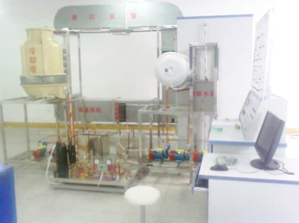 天威中央空調(diào)實驗設(shè)備是將中央空調(diào)微型化,同時保持整個中央空調(diào)教學(xué)設(shè)備的完整性和合理性。本實驗臺能單獨演示中央空調(diào)的夏天制冷、冬天制熱循環(huán),控制系統(tǒng)由總控臺采用數(shù)控電路控制。用溫度顯示器分別檢測蒸發(fā)器、冷凝器、冷卻塔、模擬鍋爐的進出口溫度,便于學(xué)員觀察、了解各物理參數(shù)的變化情況和系統(tǒng)的工作狀況。實驗臺增加了一些輔助結(jié)構(gòu),使其能人為地制造各種在實際中可能產(chǎn)生的系統(tǒng)故障,方便學(xué)員了解故障的產(chǎn)生和排除故障的方法。最大的特點是,通過傳感器將空調(diào)狀況實時反饋至電腦,能夠同時顯示蒸發(fā)器、冷凝器、模擬鍋爐、冷卻塔的進出口溫度,房間風(fēng)管溫度,隨時顯示制冷或制熱的設(shè)定溫度。有利于教學(xué)記錄、采樣、通過打印可提供進行理論分析的根據(jù)。本實驗設(shè)備配備了電腦插口、電壓表、電流表、壓力表、溫度顯示器、工作指示燈、故障演示按鈕。壓縮機、蒸發(fā)器(透明蓋)、冷凝器(透明蓋)、壓力控制器、毛細管、過濾器、膨脹閥、視液鏡、儲液器、噴淋式冷卻塔、冷卻一級泵、冷卻二級泵、制冷一級泵、制冷二級泵等。
