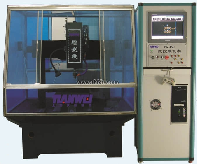 TW-450型數(shù)控雕刻機(jī)床采用龍門(mén)框架、全封閉防護(hù)式模塊化結(jié)構(gòu)設(shè)計(jì),使其具備造型合理美觀,操作維護(hù)安全方便、結(jié)構(gòu)緊湊、剛性強(qiáng)的特點(diǎn)。機(jī)構(gòu)傳動(dòng)采用高精度滾珠絲桿,燕尾導(dǎo)軌和方形結(jié)構(gòu),配置高精度驅(qū)動(dòng)系統(tǒng),具有定位精度高,移動(dòng)速度快的特點(diǎn),采用數(shù)控雕刻系統(tǒng)。