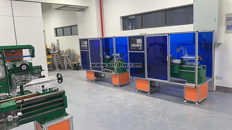 2、 車床采用全防護透明設計,框架主體采用40×40mm鋁合金型材,防護門導軌采用40×80mm鋁合金型材,推門結構,鋁合金型材內(nèi)嵌5mm厚深藍色半透明有機玻璃,整機造型美觀大方。