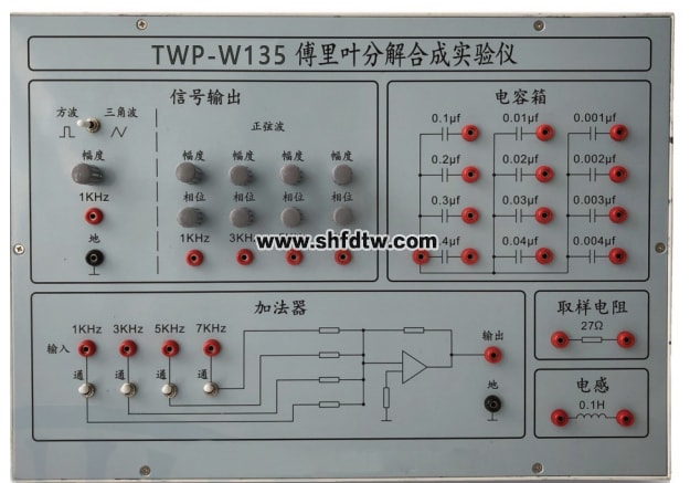 由我公司生產(chǎn)的 TWP-W135型傅里葉分解合成儀利用串連諧振電路,對方波電信號進行頻譜分析,測量基頻和各階倍頻信號的振幅以及它們之間的相位關(guān)系,然后將此過程逆轉(zhuǎn),利用加法器將一組頻率倍增而振幅和相位均可調(diào)節(jié)的正弦信號合成方波信號。通過該實驗學生可以加深理解傅里葉分解和合成的物理意義,了解串連諧振電路的某些基本特性及其在選頻電路中的應用。