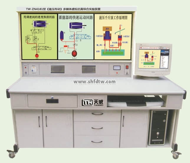 液壓傳動(dòng)多媒體虛擬仿真綜合實(shí)驗(yàn)裝置采用多種素材和媒體手段,重點(diǎn)講述液壓傳動(dòng)部分液壓流體力學(xué)基礎(chǔ)知識(shí),液壓動(dòng)力元件、執(zhí)行元件、控制元件和輔助元件,液壓傳動(dòng)基本回路。實(shí)驗(yàn)裝置采用天威液壓傳動(dòng)多媒體軟件,制作的多媒體課件內(nèi)容豐富多彩,將動(dòng)畫(huà)和二維視圖相互結(jié)合,同時(shí)配合圖板模塊文件模型,在課件中效果很好;天威多媒體軟件包含35件液壓傳動(dòng)動(dòng)畫(huà)內(nèi)容;實(shí)驗(yàn)裝置采用35件圖板模塊板供學(xué)生使用;模塊板可隨課程內(nèi)容需要進(jìn)行更換操作。