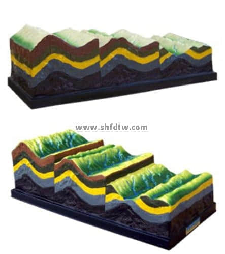 整體部分尺寸不小于510mm*230mm*170mm,清晰演示巖層最初產(chǎn)狀及新老關(guān)系,巖層遭遇外力侵蝕后的變化程度,巖層受力發(fā)生彎曲變形的褶皺構(gòu)造的基本形態(tài)與特征,褶皺構(gòu)造形成的地形特征及外力作用影響后的地形變化。