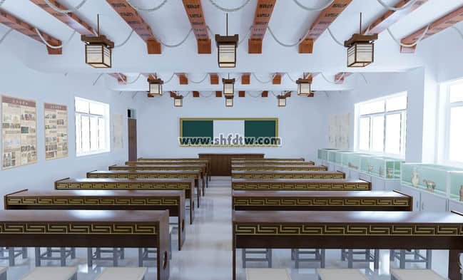 天花教學(xué)部分 天棚:采用仿古木,主體為木簡形式,手工雕刻古詩詞,
