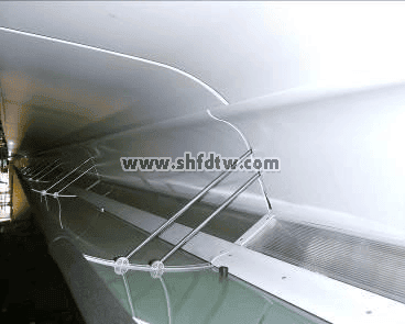 板連接,下面與行李架照明罩板連接。行李架整體結(jié)構(gòu)由鋁型材和斜拉桿組成, 鋁型材之間鑲嵌加厚陽光板,斜拉桿分段連接,并與艙體側(cè)壁結(jié)構(gòu)連接,由此組成整體的行李架結(jié)構(gòu)。