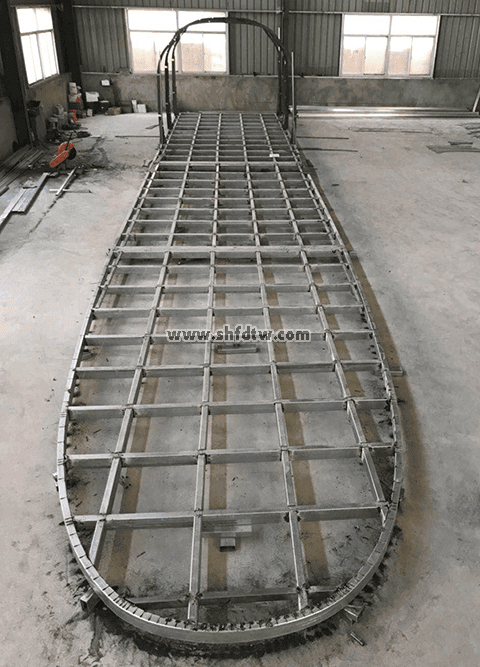 骨架為 5mm 厚鋼板高精度切割弧形焊接,在焊接、銼修處涂鐵紅防銹底漆,蒙1.5mm 厚鋼板,車身兩側(cè)切割窗口鑲嵌高級 PC 耐力透明板。