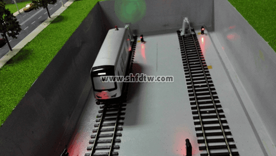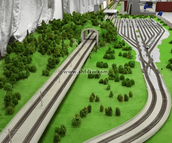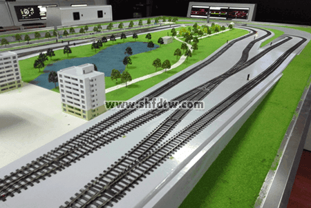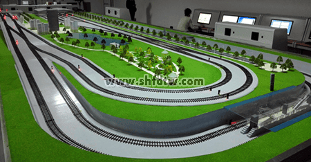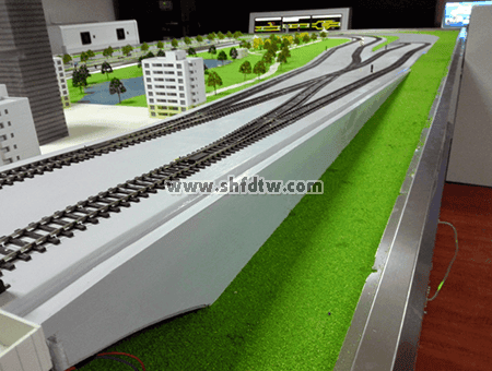 沙盤軌道線路采用仿真工字型軌道模型,表面經(jīng)過防氧化處理,美觀整潔、維護(hù)方便。軌道安放在沙盤臺面的整體道床模型上,貼合平整,轉(zhuǎn)彎曲線半徑設(shè)置合理,確保列車穩(wěn)定運(yùn)行。