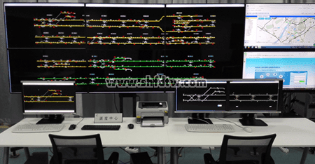 大屏顯示內(nèi)容的排列方式、視屏信號源可以隨時(shí)在線修改,用戶可以根據(jù)實(shí)際應(yīng)用需要,調(diào)整每一塊屏幕的顯示內(nèi)容。例如可將將綜合監(jiān)控、視屏監(jiān)控等其他信號投入大屏內(nèi),與信號系統(tǒng)一同顯示。拼接調(diào)試完成的調(diào)度實(shí)訓(xùn)中心綜合顯示大屏如下圖所示。