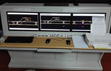 調(diào)度員培訓(xùn)工作站HMI可以讓學(xué)員實(shí)際操作ATS人機(jī)界面,實(shí)現(xiàn)站場和列車數(shù)據(jù)的顯示,完成人工進(jìn)路設(shè)置、部分或全部信號機(jī)自排全開/自排全關(guān)、追蹤全開/追蹤全關(guān)、單獨(dú)操作或鎖閉軌旁信號設(shè)備、車次號操作、控制權(quán)的交接、設(shè)置緊急停車、扣車、跳停指令、聯(lián)鎖相關(guān)的道岔單操、道岔單鎖、關(guān)閉信號、重新開放信號、封鎖(單個(gè)或全區(qū))信號、區(qū)段封鎖等功能。學(xué)員也可分析和處理工作站上出現(xiàn)的相關(guān)事件信息和故障報(bào)警信息。調(diào)度員工作站臺面及HMI的界面如下圖所示。