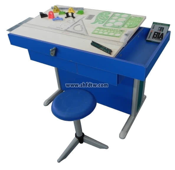 鋼木結(jié)構(gòu)桌體材料選用16mm厚優(yōu)質(zhì)雙貼面三聚胺板,桌體板截面選用優(yōu)質(zhì)PVC封邊,經(jīng)由自動(dòng)封邊機(jī)加熱180攝氏度膠封。桌體下部為左右兩邊為鋼質(zhì)支撐架連接,結(jié)實(shí)美觀; 繪圖板為高級(jí)90*60mm一號(hào)繪圖板;凳子為鋼塑結(jié)構(gòu)圓凳;