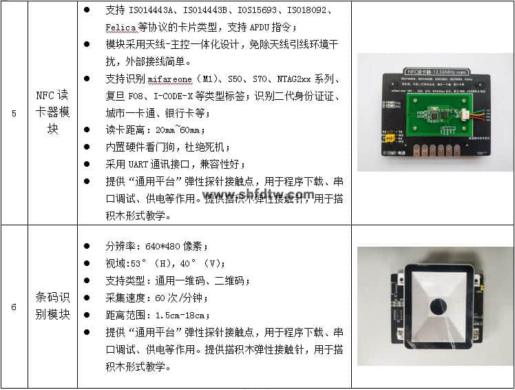(選配)RFID 射頻識(shí)別模組:125K(LF低頻讀卡器*1)、13.56M(HF 高頻讀卡器*1)、900M(UHF 超高頻讀卡器*1)、2.4G(有源RFID*2)、NFC 讀卡器(1個(gè))、條碼采集節(jié)點(diǎn)(1個(gè)),提供源碼、DEMO 例程、智能門禁等演示軟件;