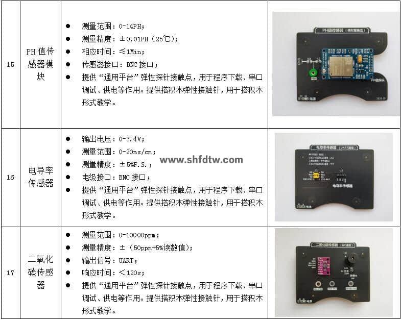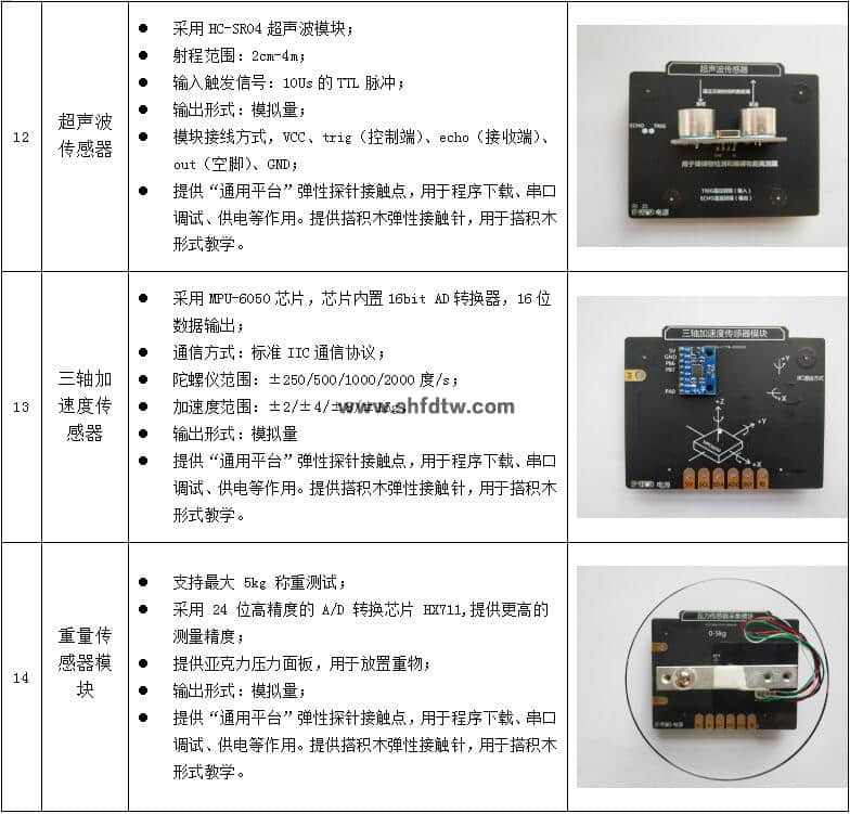 (選配)傳感器模塊:火焰、氣體壓力、PM2.5、土壤濕度、距離感應(yīng)、超聲波、加速度、PH值、電導(dǎo)率、二氧化碳、紅外測溫傳感器及其配套資料;