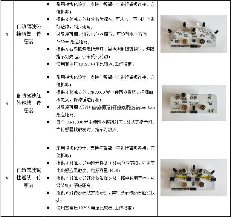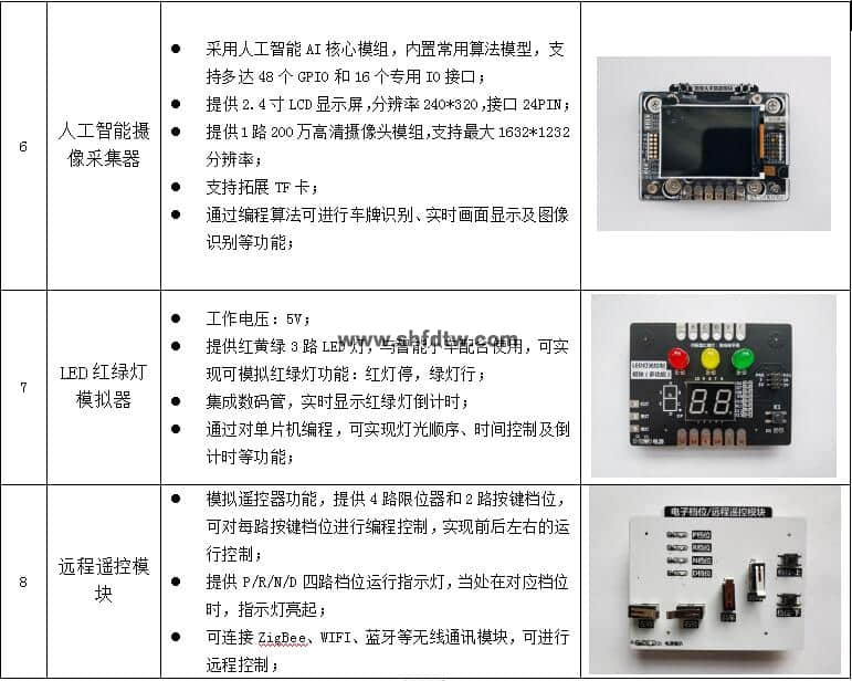 (選配)智能小車模組:智能四驅(qū)小車(1臺(tái))、嵌入式處理器模塊(1個(gè))、自動(dòng)駕駛碰撞預(yù)警傳感器(1個(gè))、自動(dòng)駕駛紅外巡線傳感器(1個(gè))、自動(dòng)駕駛磁性巡線傳感器(1個(gè))、人工智能攝像采集模塊(1個(gè))、紅綠燈模擬器模塊(1個(gè))、遠(yuǎn)程遙控模塊(1個(gè));