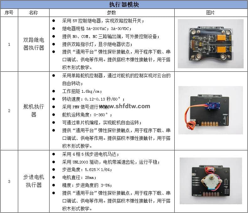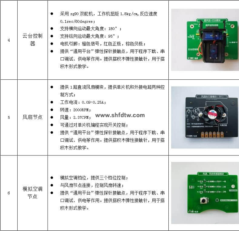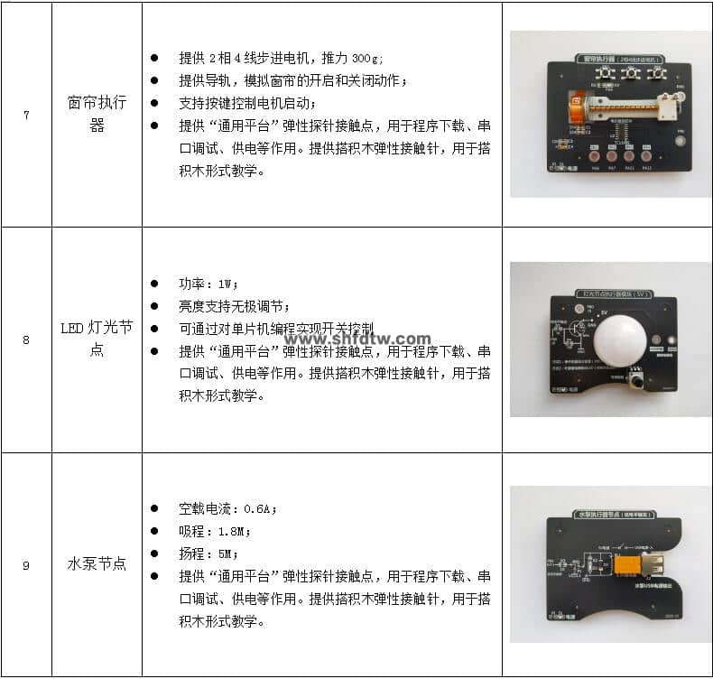 (選配)執(zhí)行器模塊:步進(jìn)電機(jī)、云臺(tái)控制、模擬空調(diào)節(jié)點(diǎn)、窗簾執(zhí)行器、LED燈光節(jié)點(diǎn)、水泵節(jié)點(diǎn)、噴霧器節(jié)點(diǎn)及其配套資料;