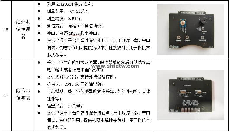 (標(biāo)配)傳感器/執(zhí)行器模塊:提供溫濕度、光照、霍爾、人體紅外、氣體、紅外對射、重量、雙路繼電器、風(fēng)扇、舵機(jī)執(zhí)行器模塊10種配套模組;
