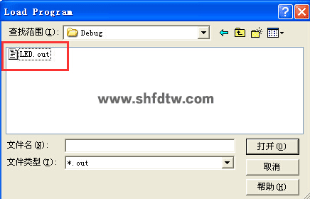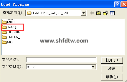 在彈出的窗口中,找到Debug文件并雙擊進(jìn)入(如果沒(méi)有該文件則直接尋址.out為后綴的文件雙擊加載),找到以.out為后綴的文件,雙擊該文件就可以加載進(jìn)DSP,如下圖6-5所示:
