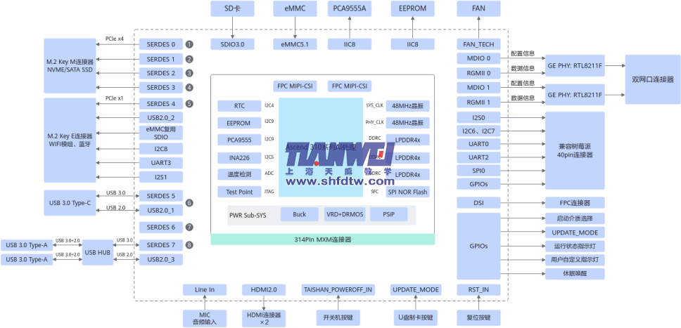 CPU :為 Ascend 310 AI 處理器,1個DaVinciV300 AI core(主頻500MHz),4個TAISHANV200M處理器核(主頻1.0GHz); 內(nèi)存:8GB LPDDR4X內(nèi)存,64bit位寬; 算力:半精度(FP16):4TFLOPS,整數(shù)精度(INT8):8TOPS; 存儲:配備8GB LPDDR4X內(nèi)存,可外接最高256GB Micro SD; 核心擴展: 40Pin擴展接口:1個; USB Type A接口:2個; HDMI接口:2個; USB Type C接口:1個; Micro SD卡接口:1個; MIPI-CSI連接器:2個,8Lane; 風扇接口:1個; 千兆網(wǎng)口:1個; |