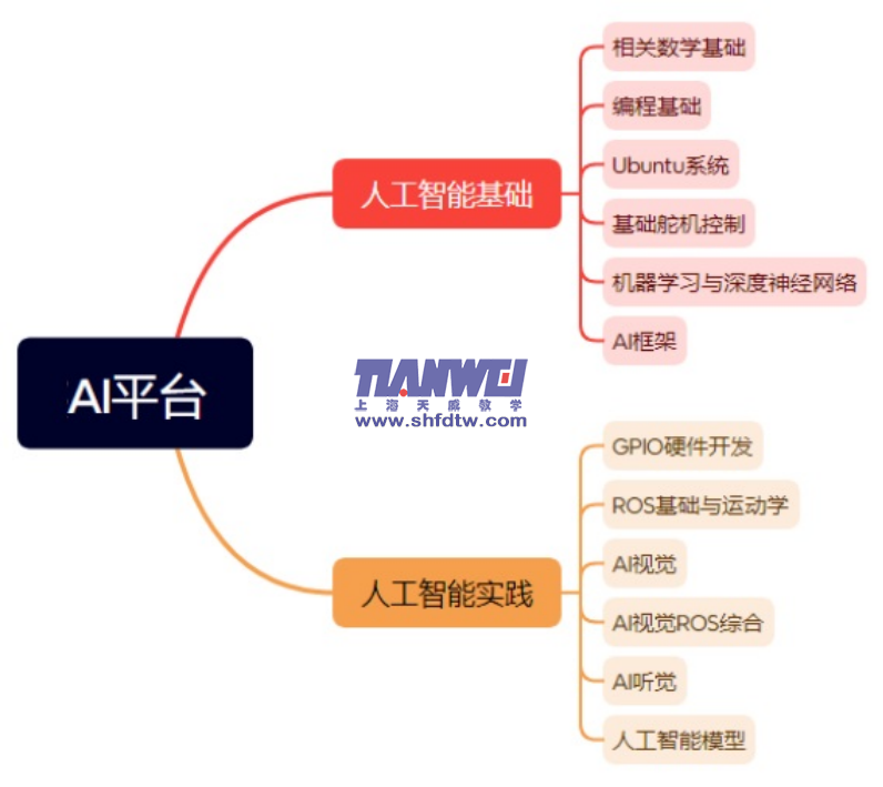 人工智能實驗平臺的學習主要分為兩個部分,第一部分為人工智能基礎(chǔ),主要包括:相關(guān)數(shù)學基礎(chǔ)、編程基礎(chǔ)、Ubuntu系統(tǒng)、機器學習與深度神經(jīng)網(wǎng)絡(luò)、AI框架、基礎(chǔ)舵機控制。第二部分主要為實踐學習包括:機械臂、AI視覺、AI聽覺、人工智能語言推理模型。完成學習后,可以充分了解到人工智能最主流的相關(guān)應(yīng)用。