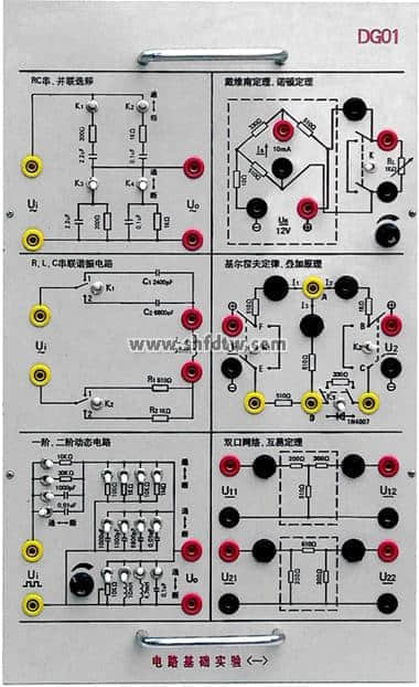 設(shè)有儀表量程擴(kuò)展實(shí)驗(yàn)電路、電路狀態(tài)軌跡的觀測(cè)實(shí)驗(yàn)電路、最大功率傳輸條件測(cè)定實(shí)驗(yàn)電路、RC雙T選頻網(wǎng)絡(luò)實(shí)驗(yàn)電路、電壓源與電流源的等效變換實(shí)驗(yàn)電路、RLC元件特性及交流電參數(shù)的測(cè)定實(shí)驗(yàn)電路。掛箱面板正面印有原理圖及符號(hào),反面焊有相應(yīng)元器件,使用方便、直觀、可靠。