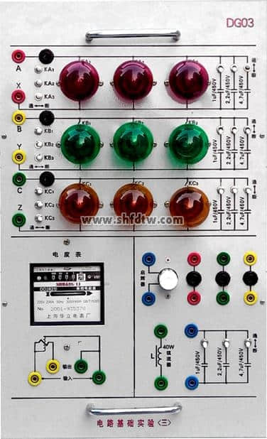 設(shè)有燈組(9個(gè)15W彩燈)實(shí)驗(yàn)電路、電容組、單相電度表、日光燈實(shí)驗(yàn)電路。設(shè)有互感實(shí)驗(yàn)電路(大小互感線圈各一個(gè))、鐵芯變壓器(36V/220V、50W)一個(gè)。