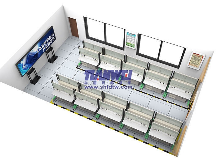 本設(shè)備由實訓(xùn)屏(內(nèi)置電源)、實訓(xùn)桌、儲物柜三大部分組成。以30mm×30mm成型方鋼作為設(shè)備主要框架材料;實訓(xùn)屏、地盤采用焊接連接、關(guān)鍵部位采用三角筋用內(nèi)六角螺釘加固連接,表面經(jīng)高溫噴塑處理,美觀大方且有效起到防銹絕緣的作用;由兩條35mm×35mm鋁合金型材及滑槽組成網(wǎng)孔板固定機構(gòu);固定機構(gòu)的下方是鐵制雙工位電源箱,每工位電源箱的布局依次為電源保護裝置、電源指示裝置、電源輸出;實訓(xùn)桌桌面采用25mm麻灰色高密度層壓板封邊特制,有效提高絕緣等級;實驗桌底部裝有至少4個導(dǎo)向輪,方便設(shè)備移動;