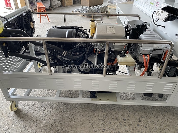 發(fā)動(dòng)機(jī)總成和發(fā)動(dòng)機(jī)控制單元、變速器、M1,M2電機(jī)、HV蓄電池、儀表總成、冷卻液溫度傳感器、進(jìn)氣溫度傳感器、節(jié)氣門控制總成、空氣質(zhì)量計(jì)、氧傳感器、點(diǎn)火開(kāi)關(guān)、整套散熱機(jī)構(gòu)、汽油箱和汽油泵總成、蓄電池、五個(gè)數(shù)字電壓表、真空壓力表及燃油壓力表、帶有完整彩色電路原理圖面板、外接式檢測(cè)端子、智能故障設(shè)置盒總成、可移動(dòng)臺(tái)架、使用說(shuō)明書及實(shí)驗(yàn)指導(dǎo)書等。