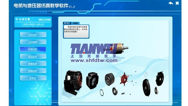 軟件包括功率電機(jī)、控制電機(jī)、信號電機(jī)和變壓器4個(gè)實(shí)驗(yàn)單元,共18個(gè)典型的實(shí)驗(yàn)項(xiàng)目,每個(gè)實(shí)驗(yàn)項(xiàng)目下設(shè)有外形結(jié)構(gòu)、工作原理、拆裝過程、故障檢測、常見應(yīng)用、考考你等數(shù)目不等實(shí)驗(yàn)任務(wù)。