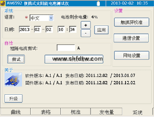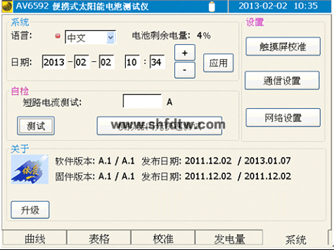 系統(tǒng)界面提供了多國語言選擇,目前提供了中文與英文兩種語言界面。系統(tǒng)界面還提供了日期與時間設(shè)置功能,方便校時。另外提供了附帶的短路電流測試功能,能夠快速測試被測陣列的短路電流。模擬器閃光快速測試是本儀器的一項獨特功能,能夠利用瞬態(tài)模擬器進行組件伏安特性測試。本界面還提供了系統(tǒng)軟件升級功能,能夠方便的通過USB盤進行系統(tǒng)升級。在本界面中提供對遠程監(jiān)控的設(shè)置功能。