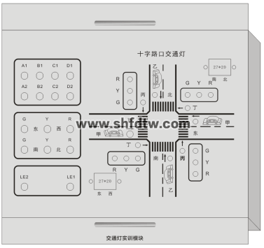 可進(jìn)行PLC編程控制模擬交通燈運(yùn)行過程。模塊使用各種顏色的LED指示燈模擬交通燈的運(yùn)行狀態(tài),交通燈包含十字路口4個(gè)方向的黃綠紅燈,包括汽車走向指示等。PLC信號(hào)通過接線端子方式連接到模塊上,學(xué)生編輯好PLC程序,下載運(yùn)行。交通燈實(shí)現(xiàn)交替點(diǎn)亮指示。提供設(shè)備架構(gòu)三維圖。