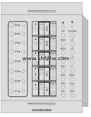 可進(jìn)行PLC編程控制模擬五層電梯運(yùn)行過程。模塊使用各種顏色的LED指示燈模擬電梯的運(yùn)行狀態(tài)、停留層數(shù)、開關(guān)轎廂狀態(tài)等。按鈕輸入模擬電梯開關(guān)轎廂開關(guān)、前往樓層層數(shù)等。PLC信號(hào)通過接線端子方式連接到模塊上。提供設(shè)備架構(gòu)三維圖。