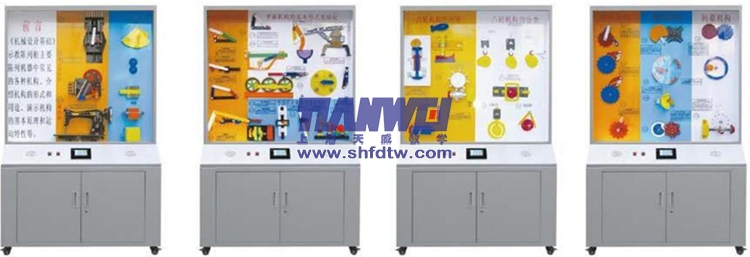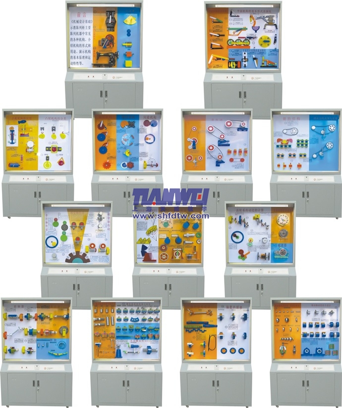 《機(jī)械設(shè)計(jì)基礎(chǔ)》示教陳列柜是根據(jù)教育部高職高專規(guī)劃教材設(shè)計(jì)的電化教學(xué)設(shè)備。本陳列柜共分十三個(gè)柜,具有多功能語音播放控制系統(tǒng)。語音解說同步演示,采用單獨(dú)驅(qū)動(dòng)由電腦或電子設(shè)備控制運(yùn)轉(zhuǎn)演示,可由遙控控制順序自動(dòng)運(yùn)行講解,又能根據(jù)教材、教學(xué)需要而遙控任意選擇還是單獨(dú)演示。柜體采用SPCC冷扎板焊成,堅(jiān)固美觀可靠,柜內(nèi)模型材料采用進(jìn)口有機(jī)玻璃和硬聚氯制作,板面附有PVC一次成型作必要的圖表和文字說明,演示形象逼真,運(yùn)行可靠,制作工藝美觀,使用本陳列柜可提高教學(xué)效果,是一套現(xiàn)代化機(jī)械課程教學(xué)實(shí)驗(yàn)室設(shè)備。