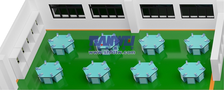 尺寸:每個(gè)工位邊長為1000mm,臺面采用50mm厚的高密度板桌面; 外包1.5mm不銹鋼板。